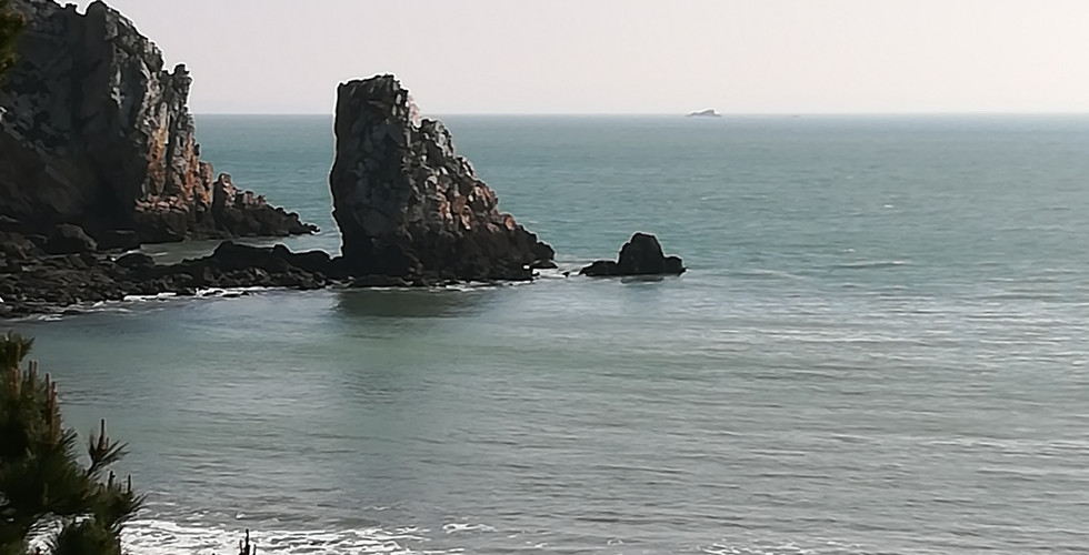 Dans la brume, de l'autre côté de la baie de Douarnenez qui s'offre à nous, on aperçoit les côtes nord du Cap Sizun.