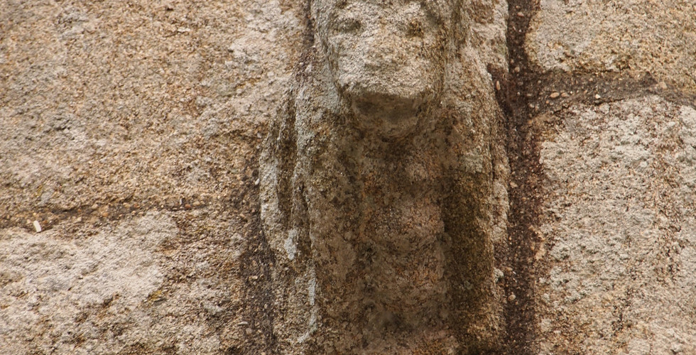 A l'extérieur, des sculptures dans la pierre : Saint Fiacre , des croix, des visages grimaçants, des têtes d'animaux, des chimères ...